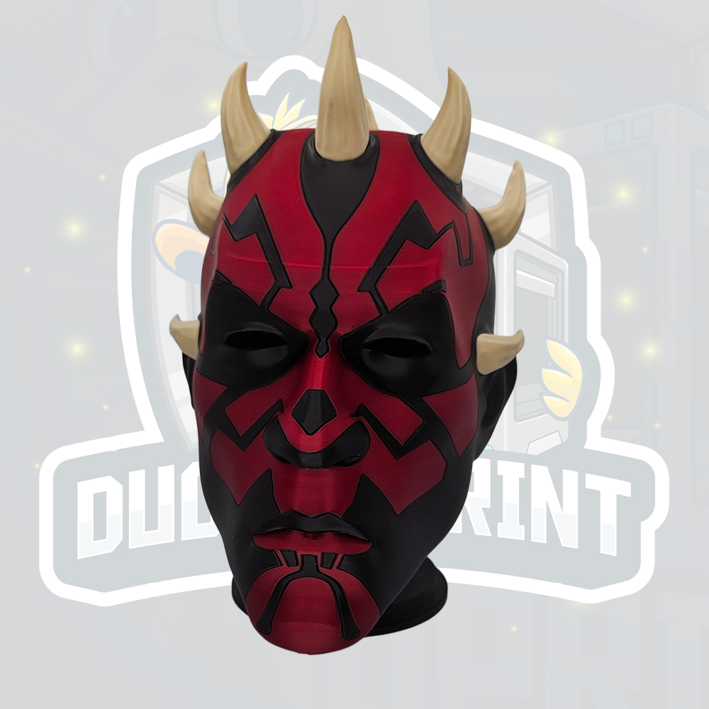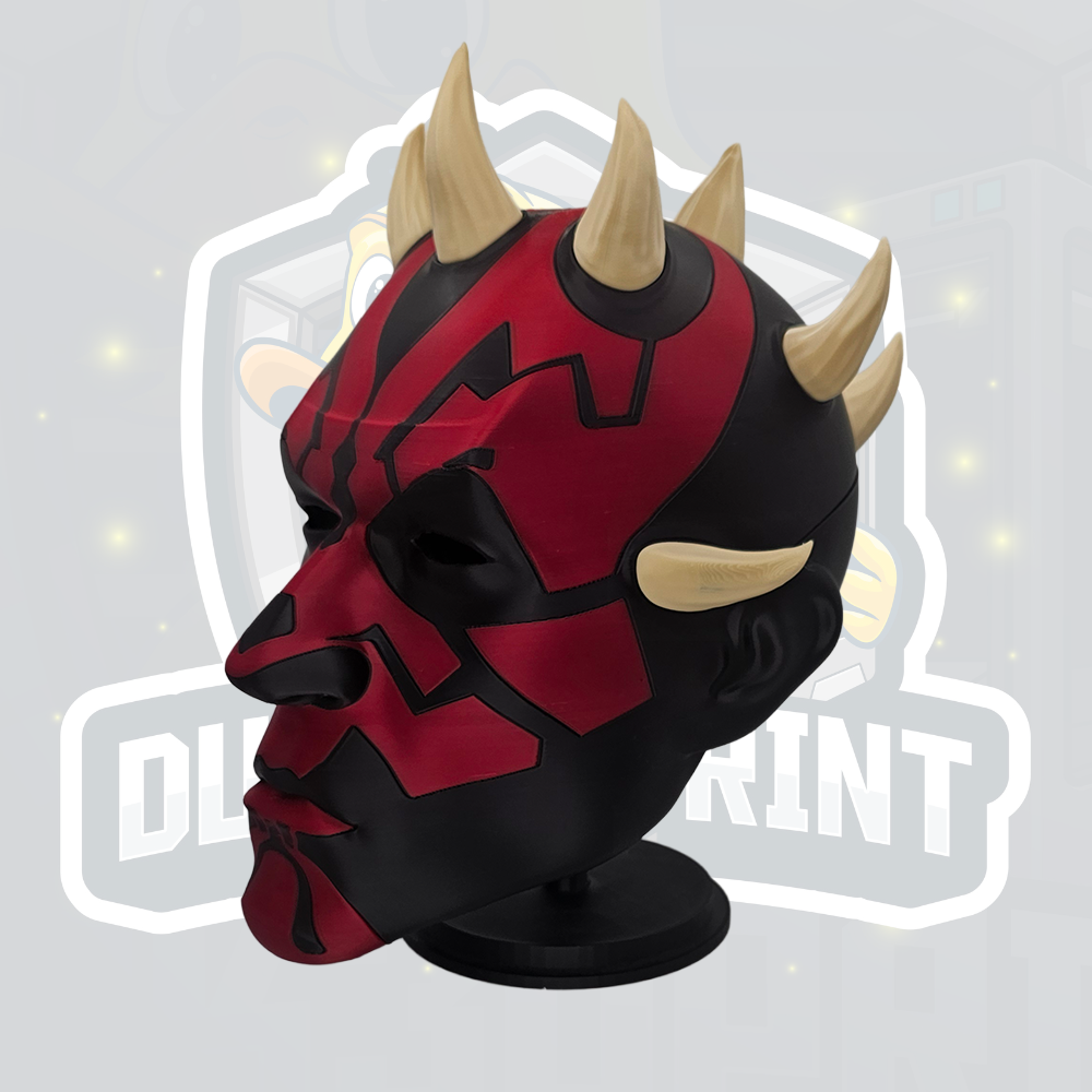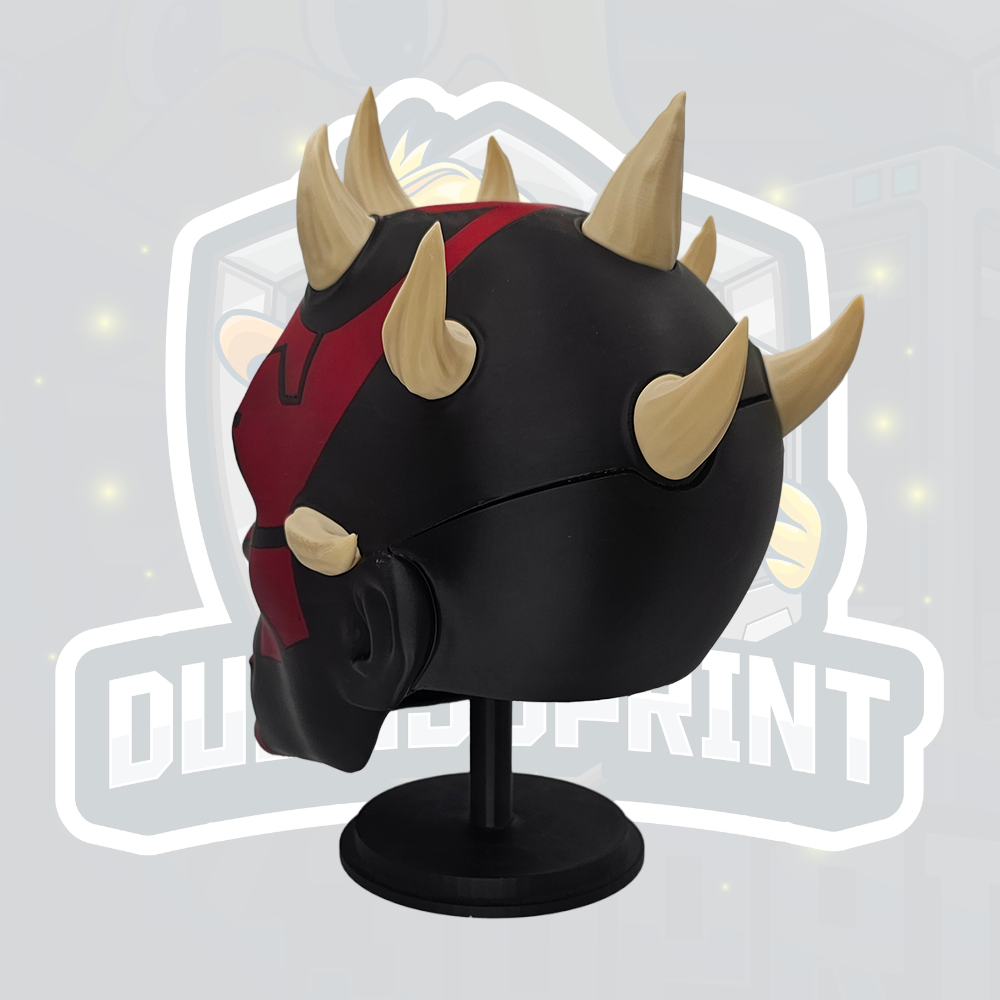Unleash your dark side with this striking red and black horned warrior helmet, inspired by classic space fantasy villains. This full-colour 3D printed helmet features a bold split red and black design with detailed sculpted facial markings and natural beige horns. Perfect for cosplay events, comic conventions, Halloween costumes, display pieces, or collectors of fantasy armour.